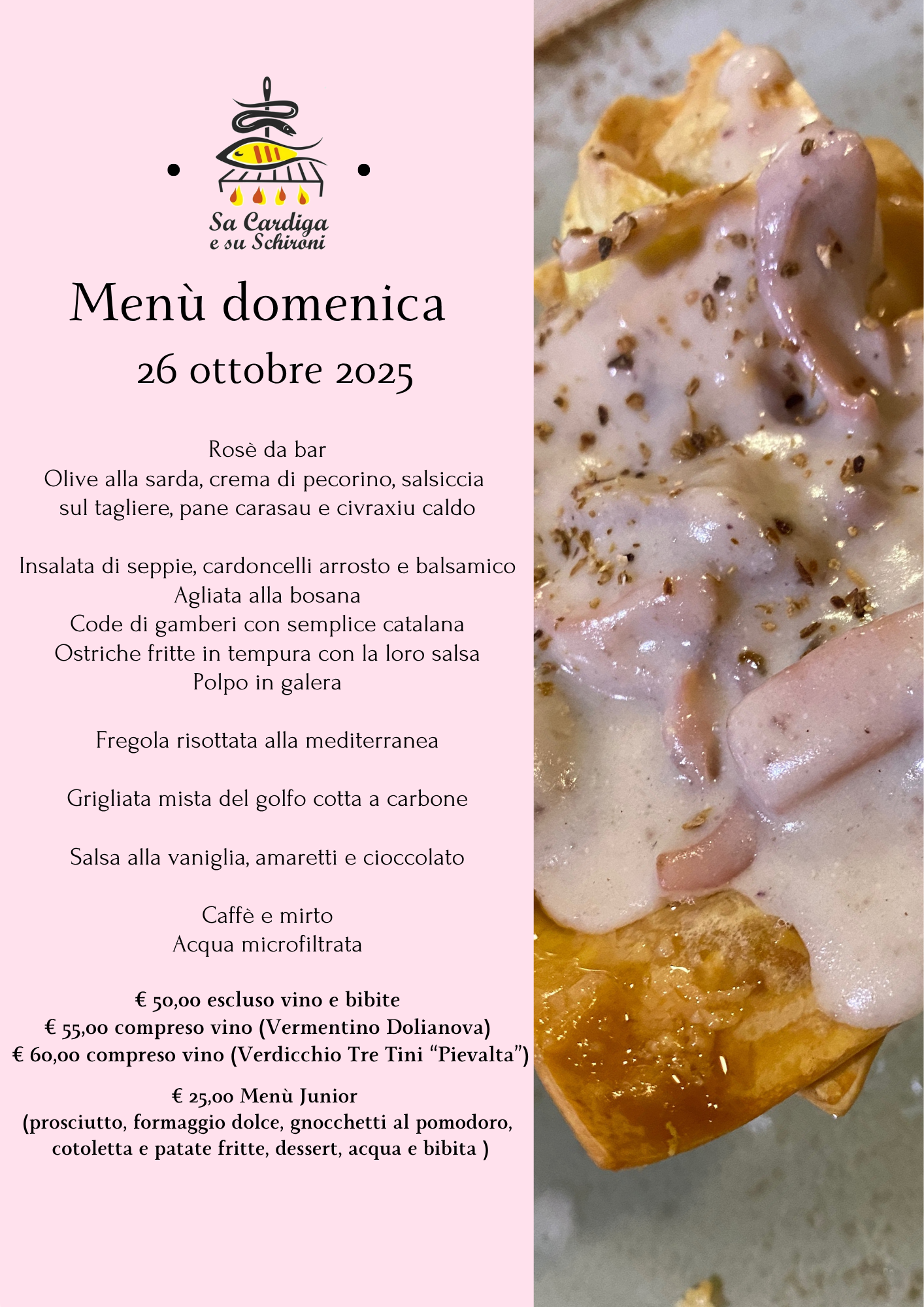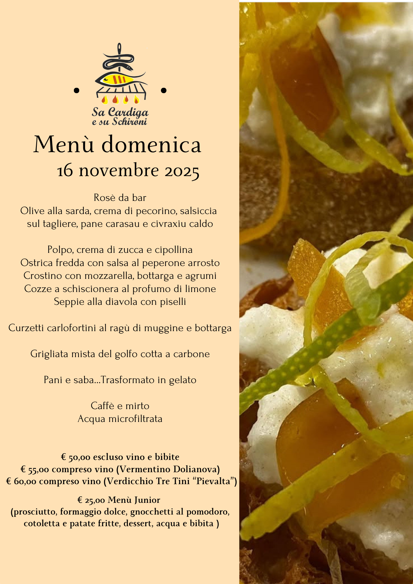 La cucina del “ Sa Cardiga e Su Schironi “ si contraddistingue per la semplicità nelle elaborazioni, il protagonista è il prodotto, cucinato alla griglia a carbone, i piatti rigorosamente seguono la tradizione regionale, come : “ Sa Burrida “; il tonno sia crudo che lessato; le tagliatelle fresche con ricci di mare e bottarga di muggine; l’aragosta alla sarda; i crostacei crudi; il pescato del giorno con la Vernaccia di Oristano e naturalmente i nostri formaggi, il classico pecorino stagionato e alla griglia con il miele, il caprino e “ su callu “, tutti accompagnati dalle nostre confetture, e in conclusione i nostri dessert come la “seadas “ o i raviolini di ricotta caldi, il semifreddo al croccante con miele e filuferru.