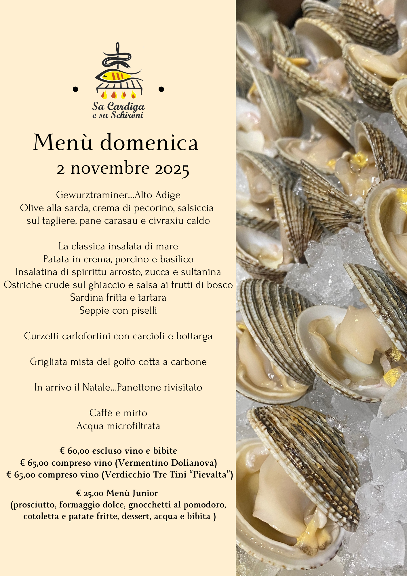 La cucina del “ Sa Cardiga e Su Schironi “ si contraddistingue per la semplicità nelle elaborazioni, il protagonista è il prodotto, cucinato alla griglia a carbone, i piatti rigorosamente seguono la tradizione regionale, come : “ Sa Burrida “; il tonno sia crudo che lessato; le tagliatelle fresche con ricci di mare e bottarga di muggine; l’aragosta alla sarda; i crostacei crudi; il pescato del giorno con la Vernaccia di Oristano e naturalmente i nostri formaggi, il classico pecorino stagionato e alla griglia con il miele, il caprino e “ su callu “, tutti accompagnati dalle nostre confetture, e in conclusione i nostri dessert come la “seadas “ o i raviolini di ricotta caldi, il semifreddo al croccante con miele e filuferru.